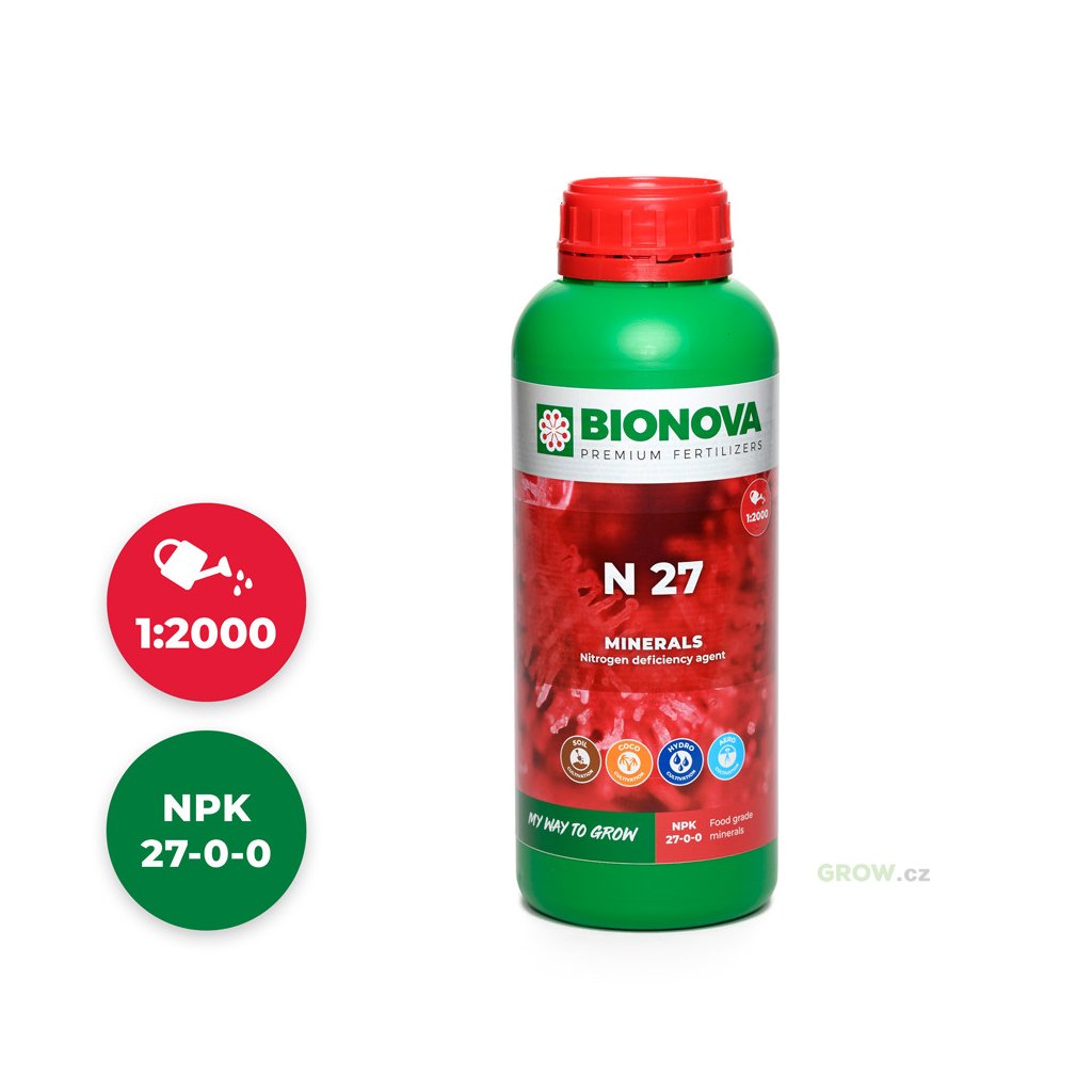 N 27 by měl být použit, když dojde k nedostatku dusíku nebo když chcete stimulovat růst rostlin. Tento produkt je možné kombinovat se všemi hnojivy Bionova, stimulátory, minerály, univerzály a substráty. N 27 může být použit jak pro zálivku, tak pro postřik na listy.