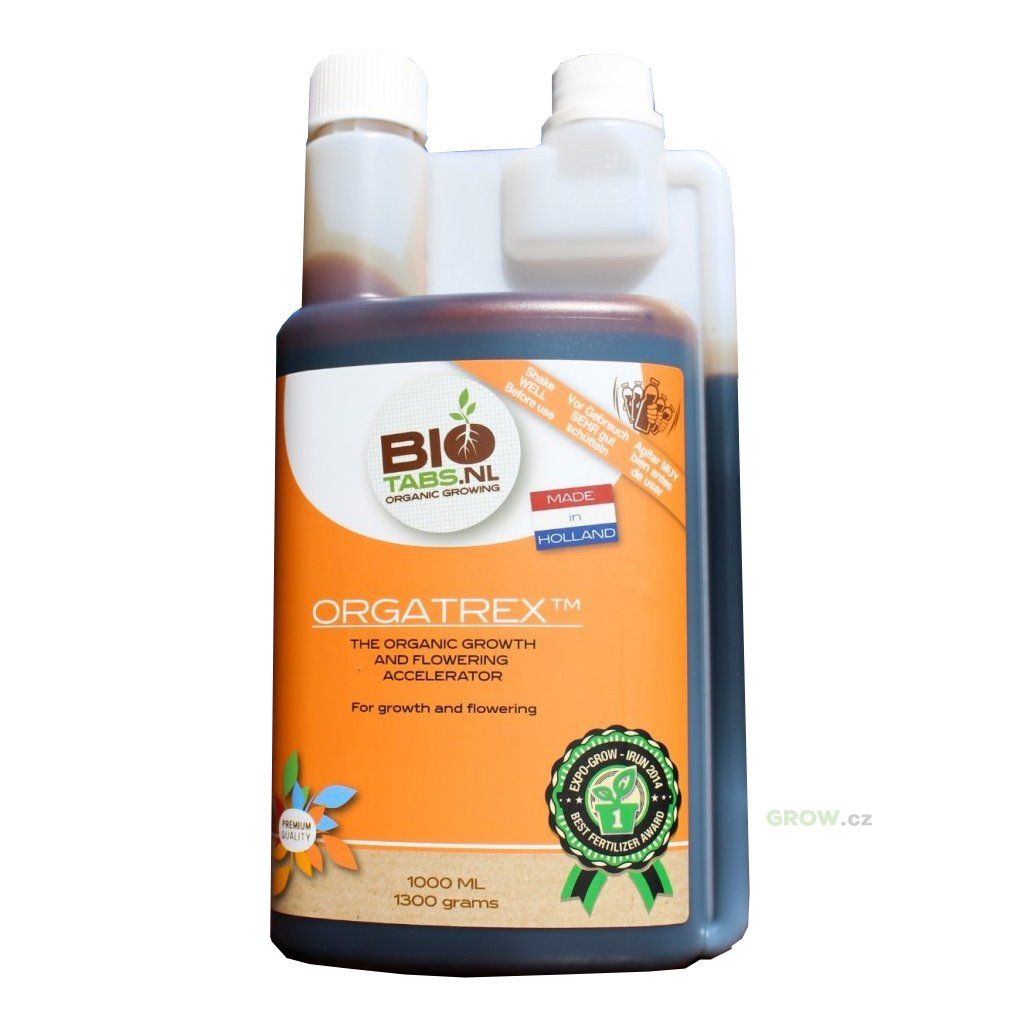 Biotabs Orgatrex je tekuté 100% organické a biologické hnojivo s vysokým obsahem cukrů na růst a květ. Organické kapalné hnojivo NPK: 5-1-5 s vyváženým množstvím: zinku, mědi, vápníku, manganu, hořčíku, síry, křemíku a železa. Orgatrex pomáhá udržovat život v půdě v optimálním stavu. Potřebujete zdravou půdu pro zdravé rostliny a Orgatrex Vám to pomůže dosáhnout. Orgatrex působí skvěle jak ve fázi růstu, tak v květu. S vysokým obsahem stopových prvků a cukrů Orgatrex pracuje v souladu s zušlechťujícími půdními bakteriemi a mykorhizními houbami.
