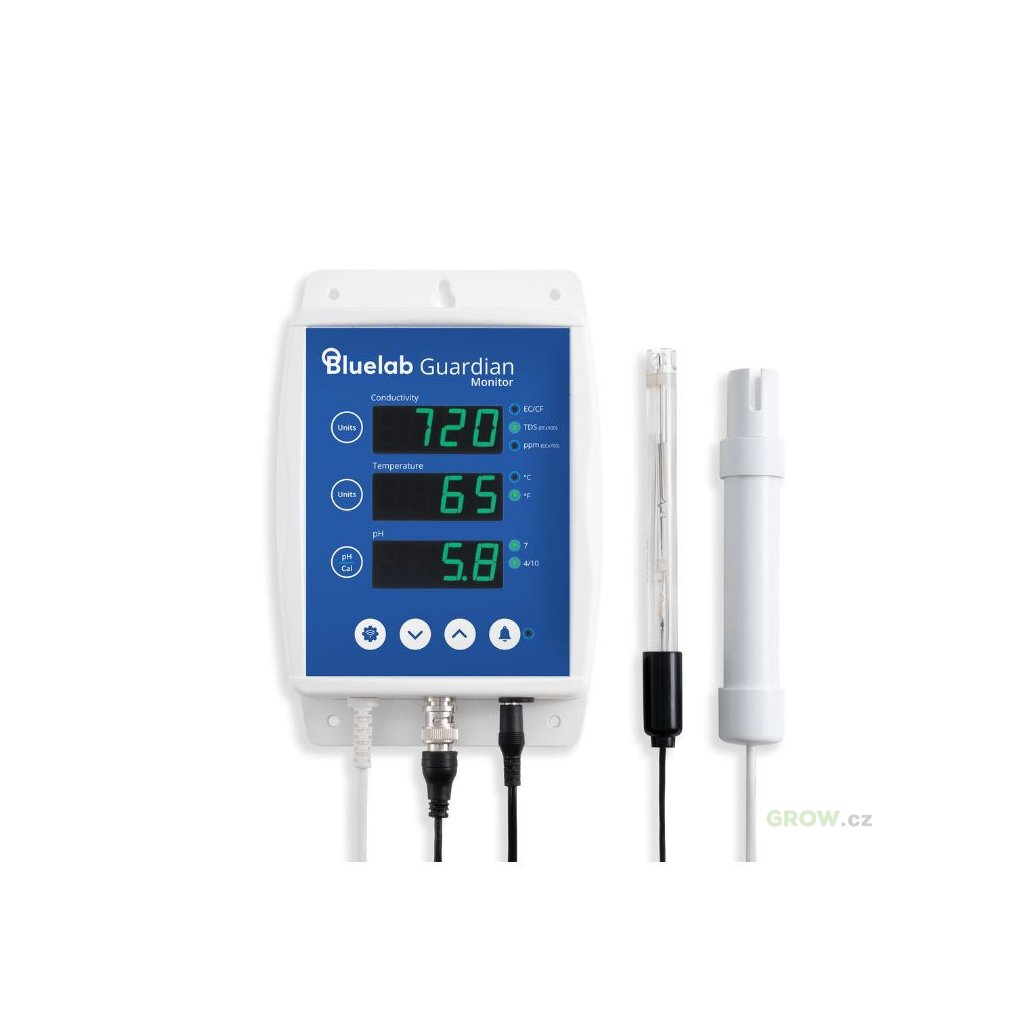 měřící přístroj pro zkušené pěstitele zajistí přesné měření a sledování pH, teploty a elektrické vodivosti pomocí dvou sond a velkého monitoru. Bluelab Guardian Monitor byl navržen pro použití uvnitř, a proto jej lze jednoduše připevnit nebo zavěsit nejen na stěnu. Obě sondy jsou připevněny na dvoumetrových kabelech.