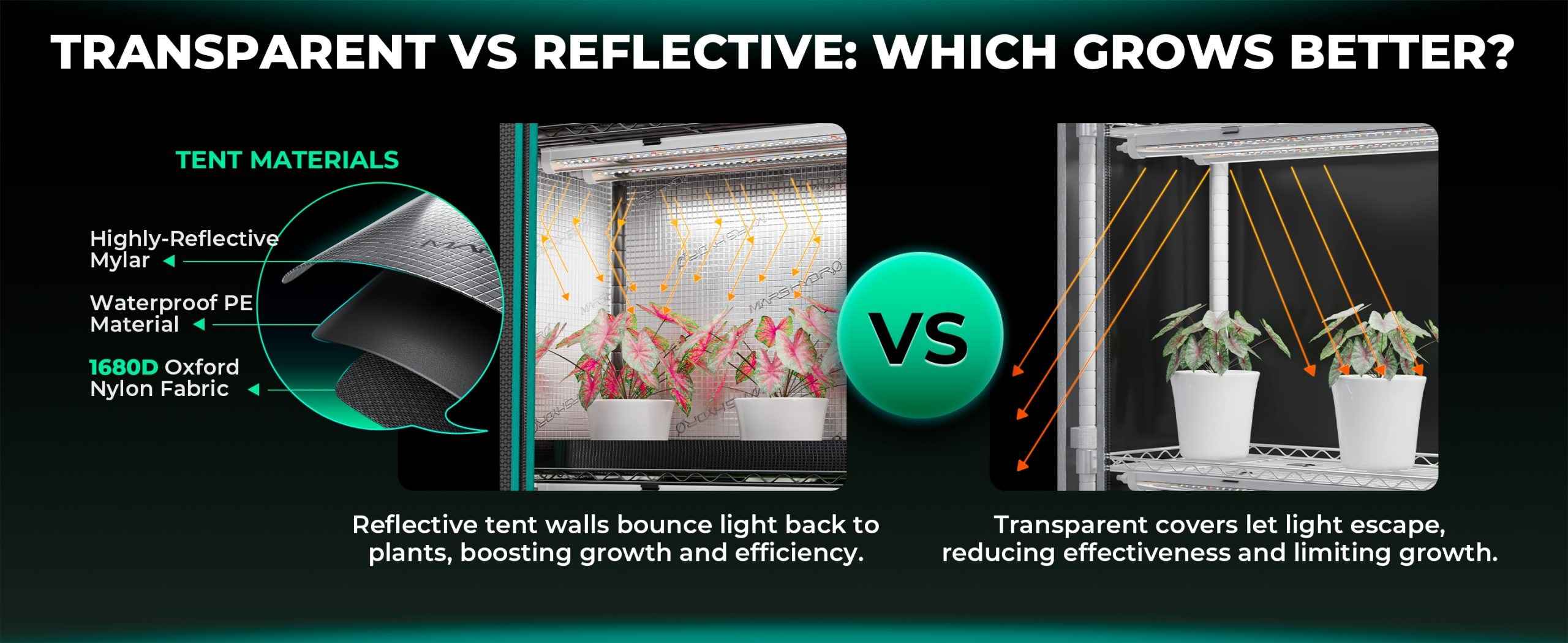 - All-in-One Controlled Environment: Kovový rám a uzavřený stan udržují stabilní vlhkost a teplotu, zatímco full-spectrum LED světla simulují přirozené sluneční světlo, což eliminuje vliv počasí a ročních období.