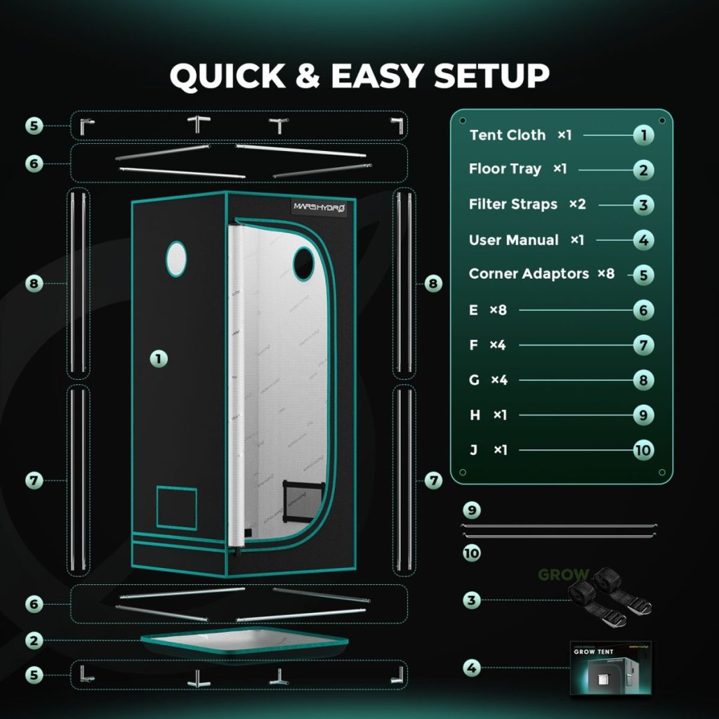 Set je navržen tak, aby poskytoval cenově dostupné a bezproblémové řešení pro domácí pěstírnu. Obsahuje vše, co potřebujete pro okamžitý start – od LED světla a ventilace po praktické doplňky. Díky tomu odpadá stres z výběru správného vybavení a můžete se naplno soustředit na samotné pěstování.