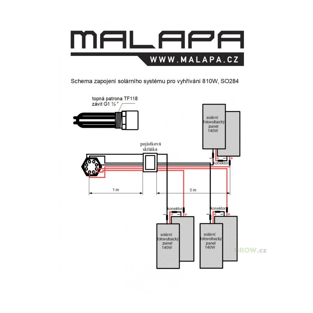 Pojistková skříňka mezi solárními panely a topnou patronou, jističe pro ochranu a odpojení solárních panelů. Kabel mezi solárními panely a pojistkovou skříňkou ukončený solárními konektory dlouhý 5 metrů. Kabel mezi pojistkovou skříňkou a topnou patronou ukončený oky dlouhý 1 metr. Celý systém pracuje s bezpečným napětím. Na spodní straně rámu solárního panelu jsou otvory pro možné přichycení. Montáž solárního panelu nejlépe na jižní stranu, ideální sklon 35 °, solární panel dosáhne svého nominálního výkonu při slunečném počasí. Ve fotogalerii produktu najdete rozměry, schéma zapojení výrobku a orientační tabulka ohřevu vody (kapaliny). Na přání lze dodat i jiné varianty, například jinou délku kabelu.